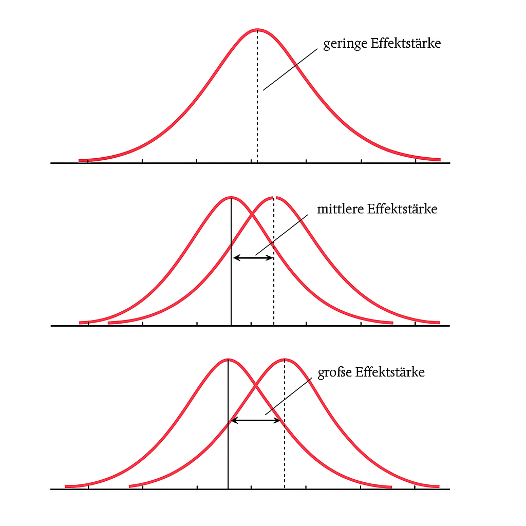 Während p-Werte anzeigen, wie wahrscheinlich ein beobachteter Unterschied unter der Annahme der Nullhypothese ist, beschreibt die Effektstärke die tatsächliche Größe eines Effekts oder Einflusses. In der empirischen Forschung ist sie zentral, da sie die Ausprägung eines Effekts quantifiziert und die Grundlage für die Planung zukünftiger Studien liefert – etwa zur Bestimmung der notwendigen Stichprobengröße.