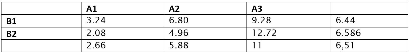 Das Auslassen der dritten Stufe von Faktor A beeinflusst die Mittelwerte von Faktor A selbst nicht direkt, jedoch ändert es die Mittelwerte des Faktors B sowie den Gesamtmittelwert. Da Faktor A ein zufälliger Faktor ist, wirkt sich sein Fehlen auf die Mittelwerte der Stufen von Faktor B aus. Dadurch sind wir zwar noch in der Lage, die Mittelwerte zu vergleichen, aber es ist nicht mehr möglich zu sagen, dass die Unterschiede unabhängig von Faktor A sind. Aus diesem Grund können die Ergebnisse der Stufen des zufälligen Faktors nicht mehr generalisiert werden.