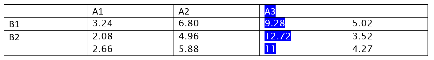 Der Effekt des Faktor B bei der Berechnung der Mittelwerte für die Stufen des Faktors A wird sozusagen auf 0 gesetzt. Dadurch können wir die Unterschiede, die wir zwischen den Mittelwerten des Faktors A finden, über die Stufen des Faktors B generalisieren. Ebenso funktioniert die Generalisierbarkeit der Unterschiede im Faktor B über die Stufen des Faktors A hinweg.