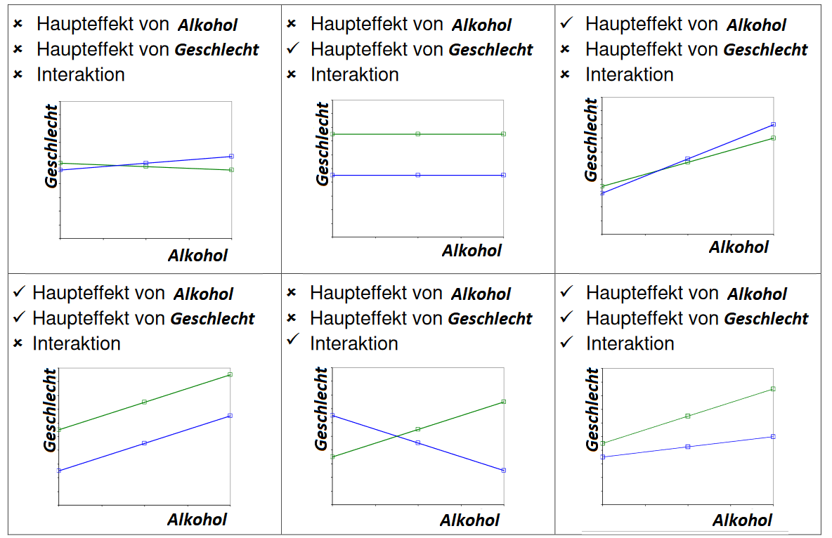 Interaktionseffekte (Wechselwirkungseffekte) betrachten die Wirkung eines Faktors (A) in Abhängigkeit von einem anderen Faktor (B), wo­bei gilt, dass der Einfluss der UV zwi­schen den Faktor­stufen des einen Faktors un­ter den Stufen des an­deren Faktors un­gleich aus­fällt. Z. B. kann sich der Alkoholgehalt des ersten Cocktails auf die Anzahl der gesungenen Songs in Ab­hän­gig­keit des Geschlechtes un­terschied­lich aus­wir­ken. Ist ei­ne si­gni­fikante In­ter­akti­on vor­handen, ist bei der In­terpretati­on der Haupt­ef­fekte Vor­sicht geboten.
