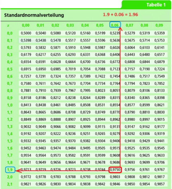 Die Tabelle enthält z-Werte, die auf zwei Stellen hinter dem Komma gerundet sind: z.B. 1,07 oder 1,96. Gesucht wird die Wahrscheinlichkeit, daß maximal ein z-Wert von 1,96 auftritt ("Zeile": 1,9; "Spalte": 0,06). In der Zeile mit z = 1.9 und in der Spalte mit 0,06 bilden die gesuchte Wahrscheinlichkeit (1-a)=0.025 - (1-0.975)=0.025.