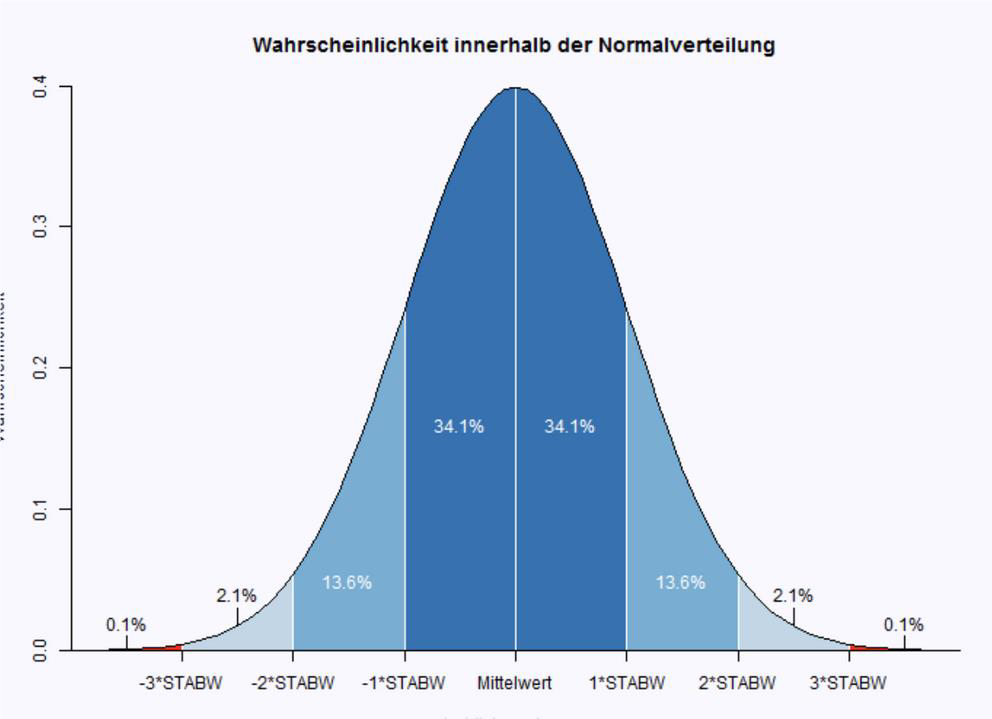 Ausprägungen der Variablen in sehr guter Näherung durch eine Normalverteilung beschrieben. Das Aussehen einer Normalverteilung ähnelt sehr einer Glocke, wobei die Funktionswerte der Kurve gegen 0 streben, wenn man die x-Werte gegen Unendlich gehen lässt. Normalverteilungen sind symmetrisch um den Mittelwert verteilt (d.h. die Schiefe beträgt 0). Beim Mittelwert besitzt die Verteilung ihr Maximum. Die Fläche zwischen der Kurve und der x-Achse beträgt 1.