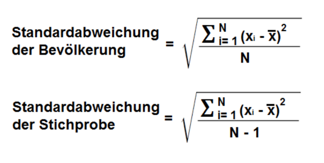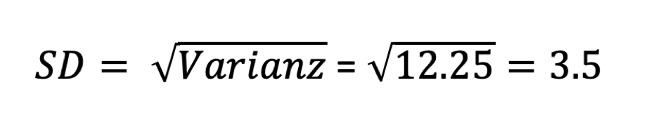 Die Standardabweichung (s, englisch "standard deviation" oder kurz "SD") ist die Quadratwurzel der Varianz. Im obigen Beispiel wird die Standardabweichung wie folgt berechnet: